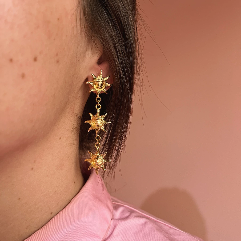 Par de aros hechos a mano en broce bañados en oro, con triple dije de sol y ojo.