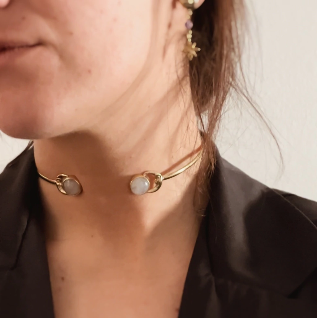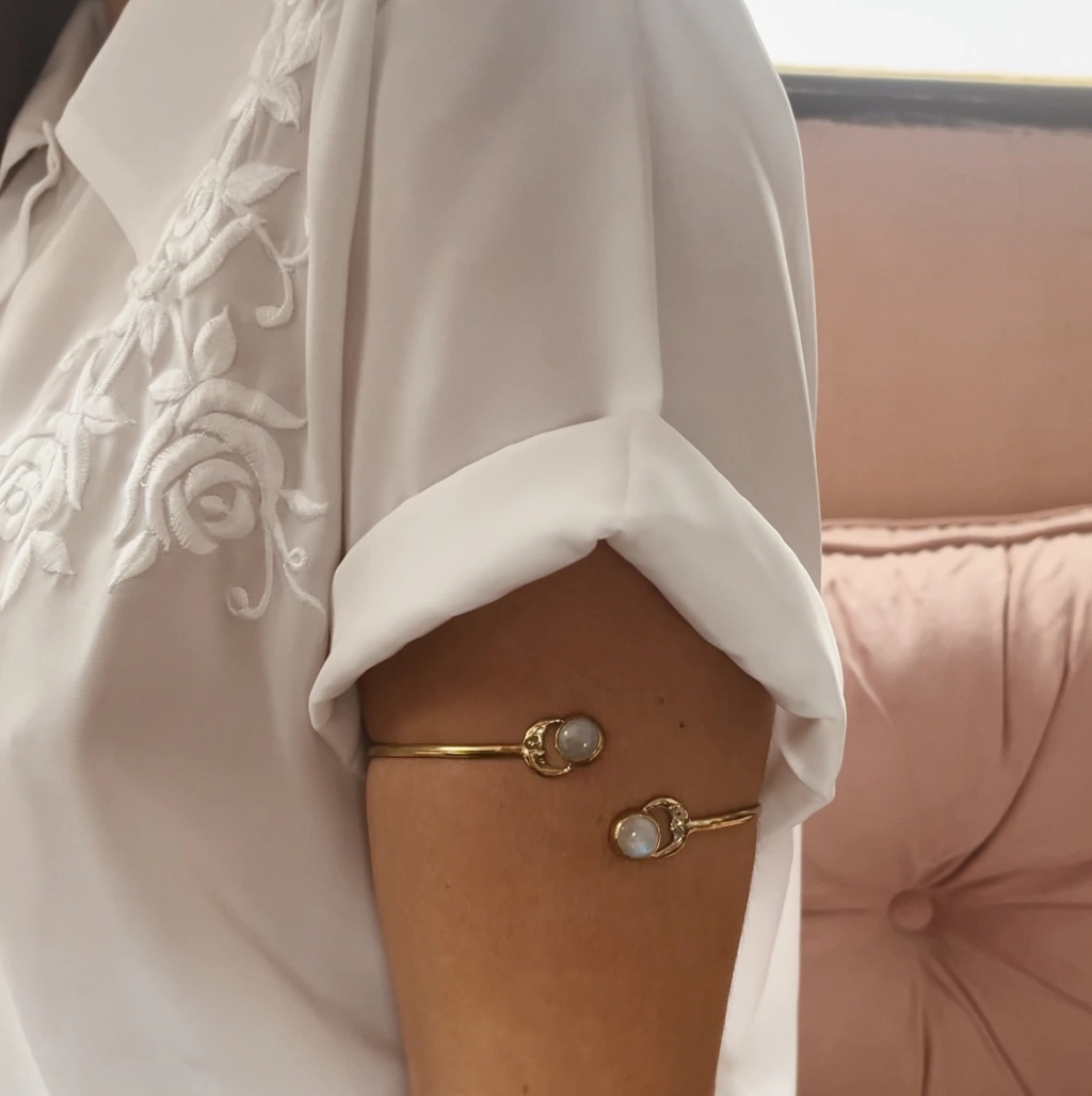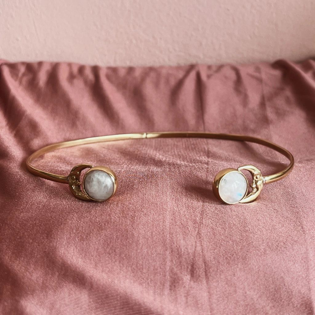 Brazalete regulable de bronce con doble engarce de piedra lunar.