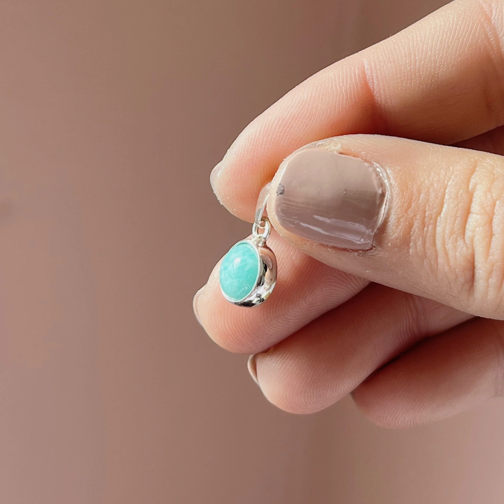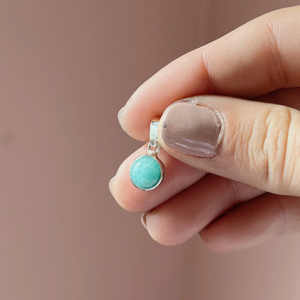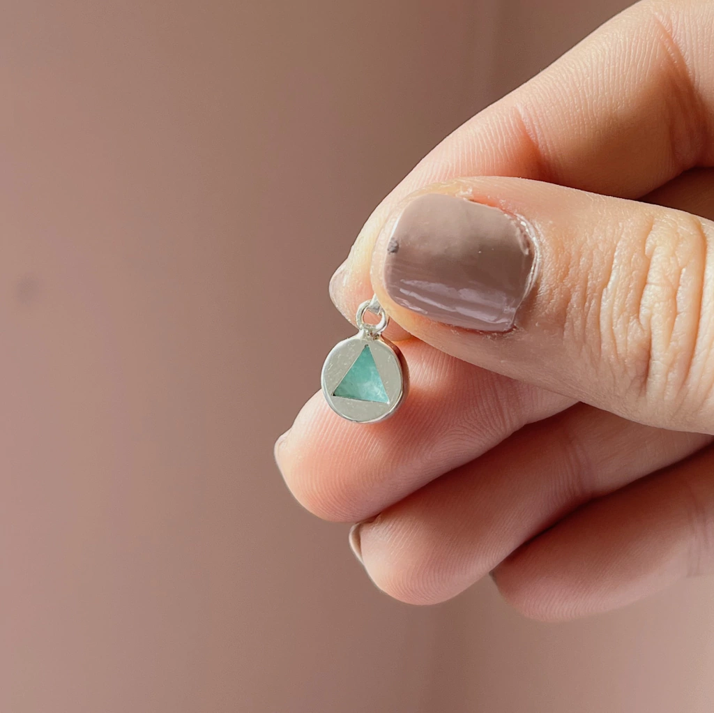 Piedra redonda de 8 mm engarzada en Plata 925 con detalle de triángulo calado atrás representando el equilibrio entre cuerpo, mente y alma.
