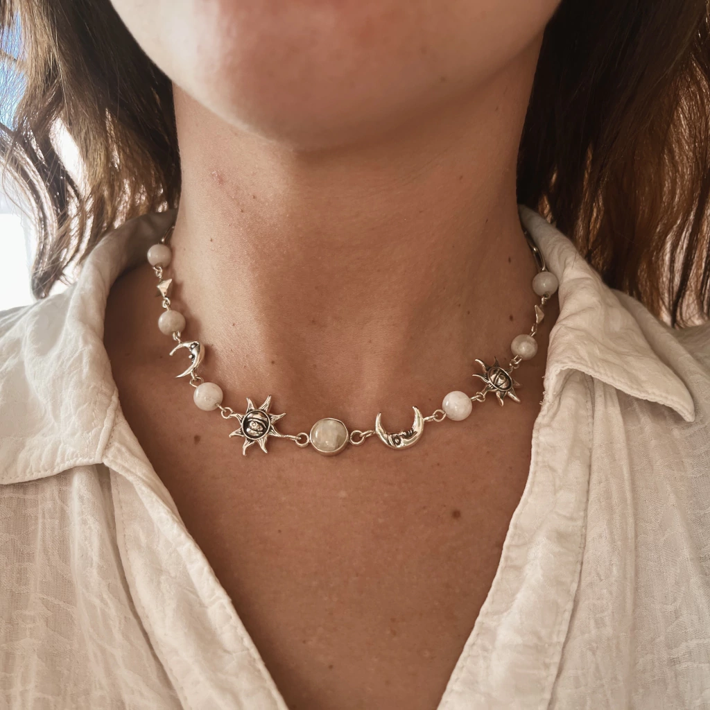 Este collar se trata de una pieza unica realizada a mano integramente en plata 925. Con un cabujon de piedra lunar natural como centro acompañado de soles, lunes y esferzas de piedra lunar entrelazados, formando un patron de cadena que te permite lucir esta joya unica como collar sobre el pecho o bien cortito como choker. Cadena final regulable para que se adapte a distintos largos.